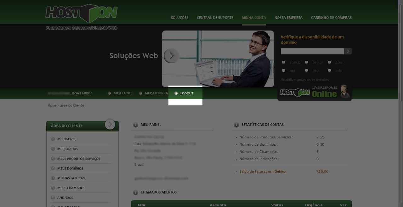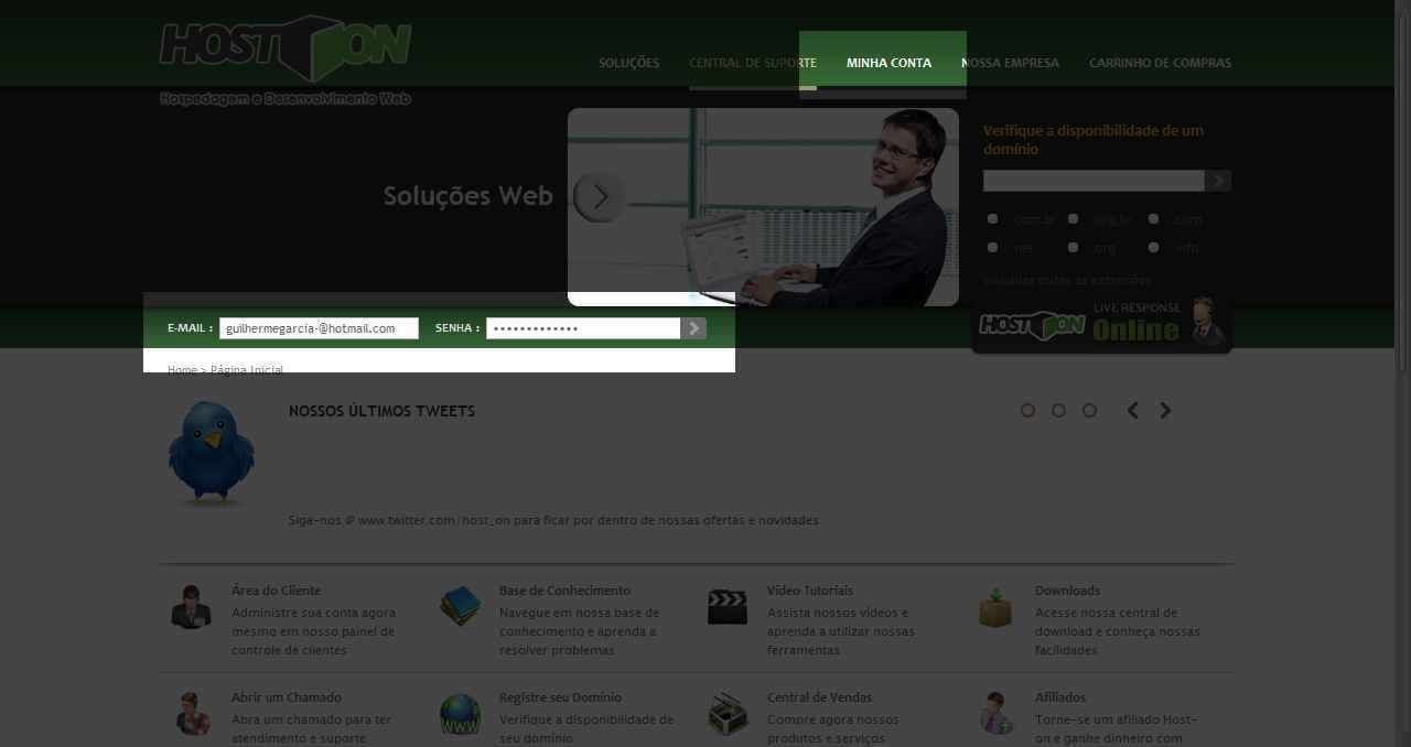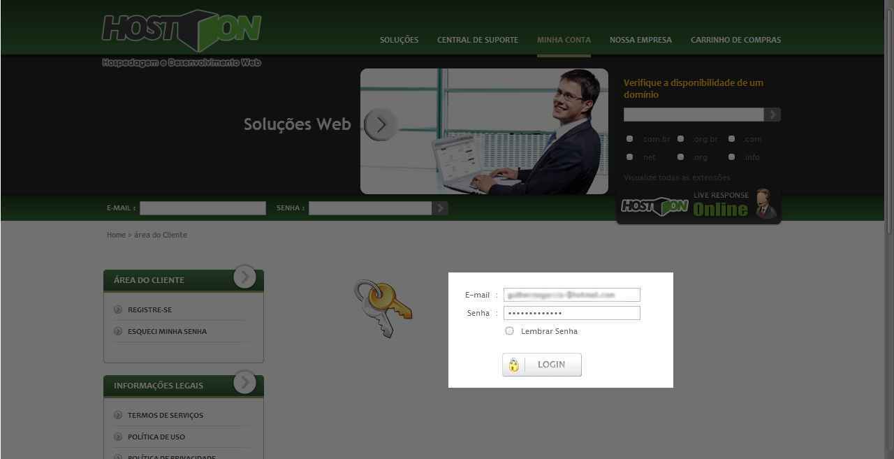Acesse www.host-on.com.br preencha os campos diretamente na home ou clique em "MINHA CONTA".